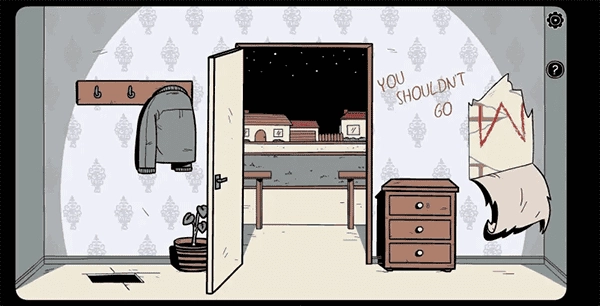 10、向右转,点击窗户把窗帘拉上,再戴上手套完成右侧的线路拼图,之后打开上方的开关。随后前往画叉的门所在位置,将开关安装到房间电灯的电源线上,关闭灯光后留意墙上的提示。