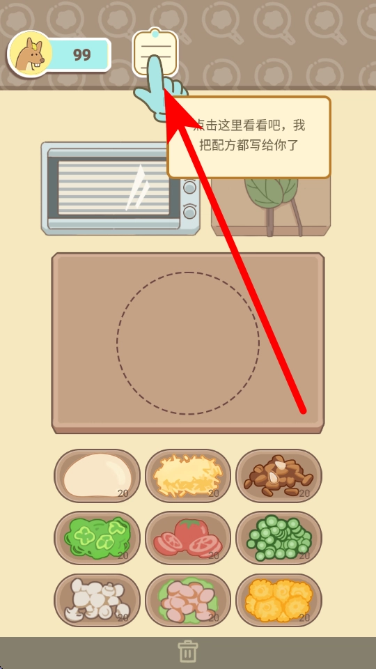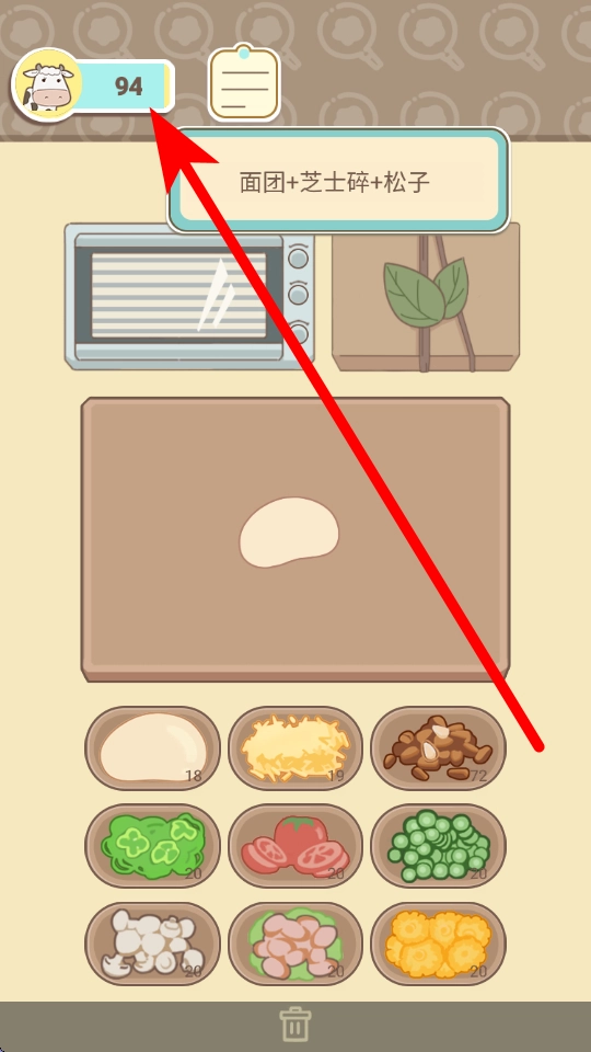 1、制作菜品时,能查看配方提示,挑选面团、芝士碎、松子这类食材,把食材进行合理搭配后,借助烤箱等厨具来制作,做好的美食可以用来售卖,从而获得经营收益。