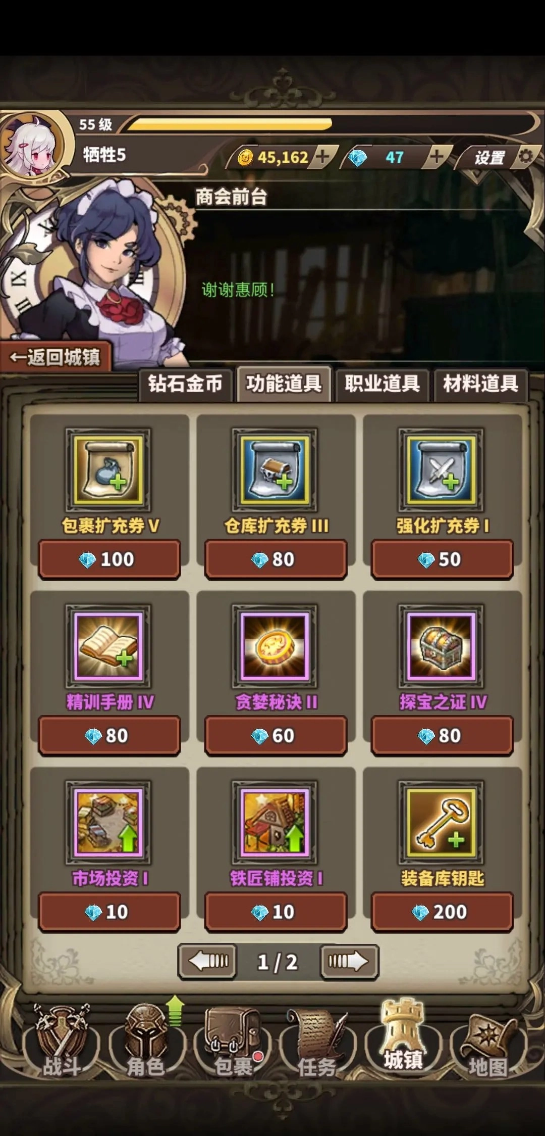 ④仓库与背包的初始容量都很小,但升级速度很快,因为前两次升级所需的钻石数量没有变化,都是25颗。这样一来,只需花费4个25颗钻石(总共100颗),就能让背包和仓库的容量得到显著提升。总体而言,各项功能的优先升级顺序为:挂机时间>背包仓库>金币获取>装备爆率。