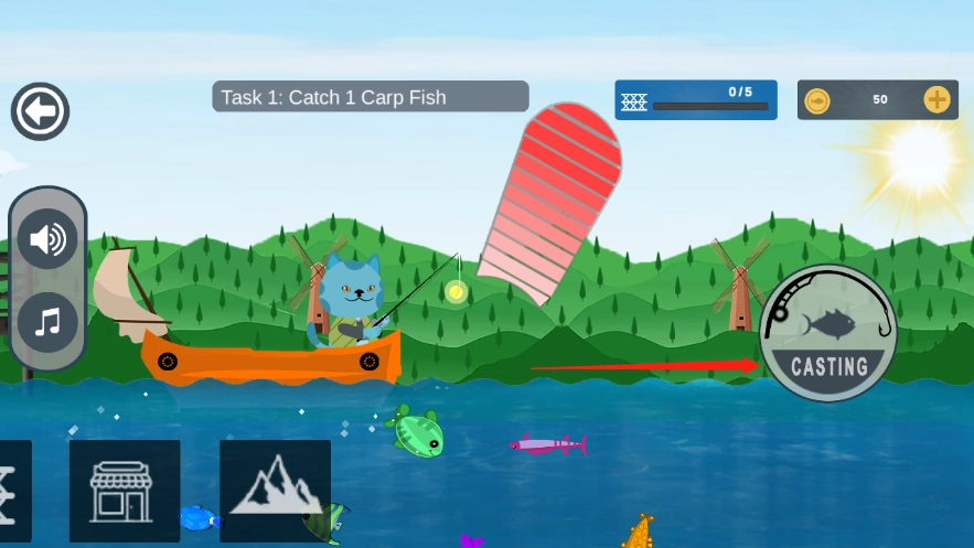 2、接着点击下方的这个按钮,就能把鱼竿抛进水里;长按的时长越长,鱼线就会越放越长。