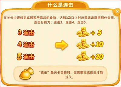 4、连连上菜:通过连击收集额外金币,达成额外金币目标营业额。