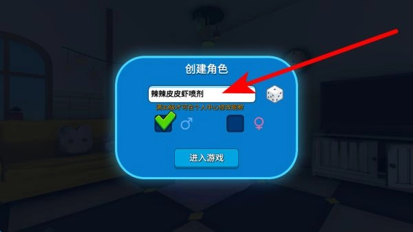 1、进入后,先进行角色创建,可设置角色名称、选择性别等,完成后点击进入游戏,开启躲猫猫之旅。