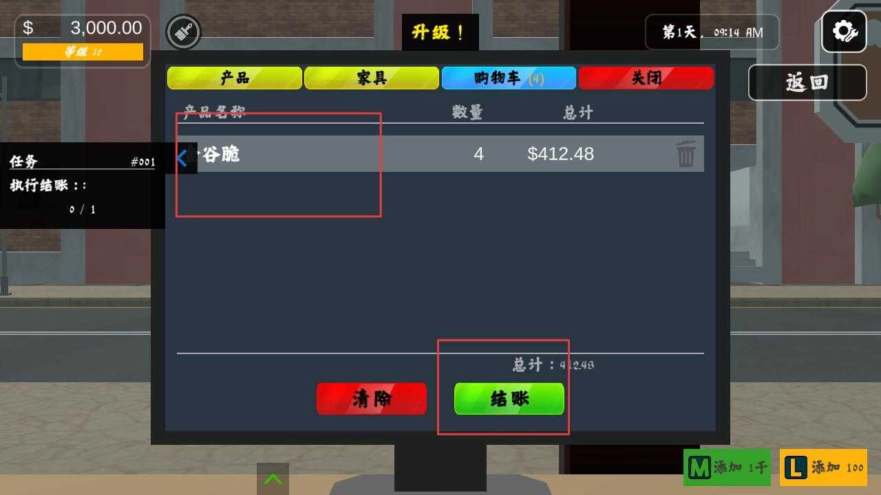 4、在采购界面挑选好商品,例如谷脆,确认好数量和总计金额后,点击结账按钮,完成商品采购流程,以此为超市补充货物。