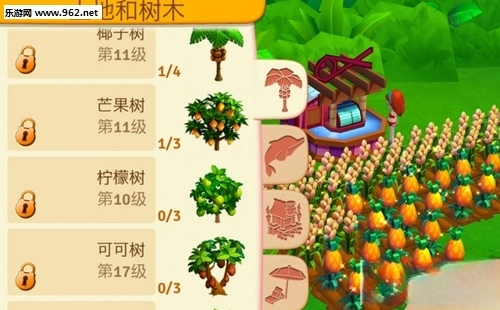 在游戏中随着等级的提升会有不同的果树可供采摘,其中比较基础的有椰子树,芒果树等等,这些树的果实,不仅可以直接送货完成任务,还能为酒吧制作各种饮品。特别是椰子树。玩家一定要好了就摘。