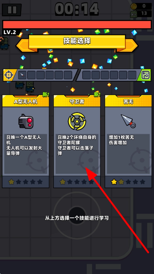 3、当满足特定条件时,会弹出技能选择界面,A型无人机、守卫者、苦无等技能均可在此选择,各类技能具备不同的作用效果,玩家能够依据战斗需要等情况来挑选学习。