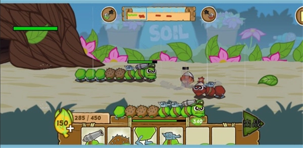 4、刚开始可以先派一只普通的毛毛虫去阻挡敌人的进攻,之后借助收集到的叶子,生产出更厉害的虫兵。