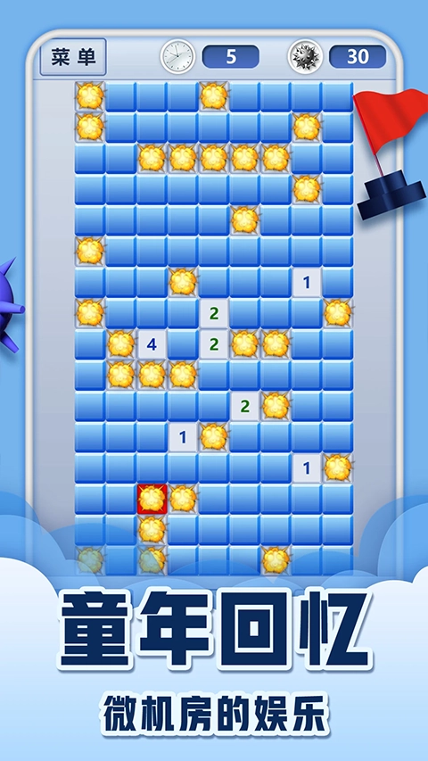 2、要是你觉得某个方块底下或许藏着地雷,能点击进入插旗模式,在方块上插个旗子当作警示。已经翻开的数字会表明其周围8个格子里地雷的总数,帮你推断出哪些是安全的方块。