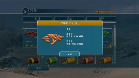 根据提示,选用橙色飞蝇幼虫作为鱼饵。一切准备妥当后,下钩!