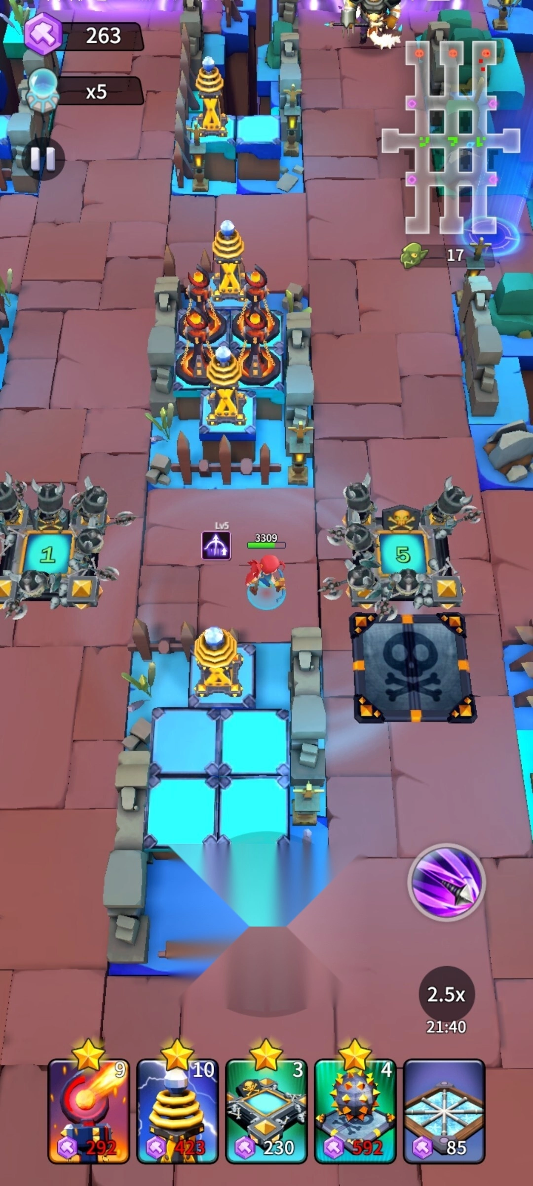 4、滚石陷阱属于重型输出装置,关卡17前务必完成四点安置(左翼三,右翼一),以压制高血敌群。