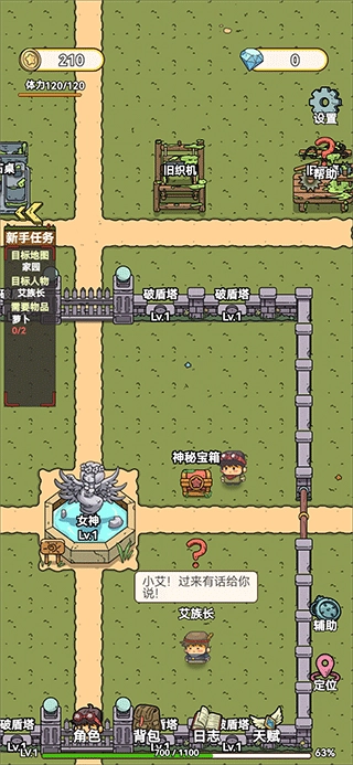 1、先拾取艾族长上方的宝箱,里面装有1000金币、30钻石等物品,后续会派上用场。完成这一步后,再与艾族长对话接取任务。该任务以引导基本操作流程为主,艾人老玩家可快速跳过。