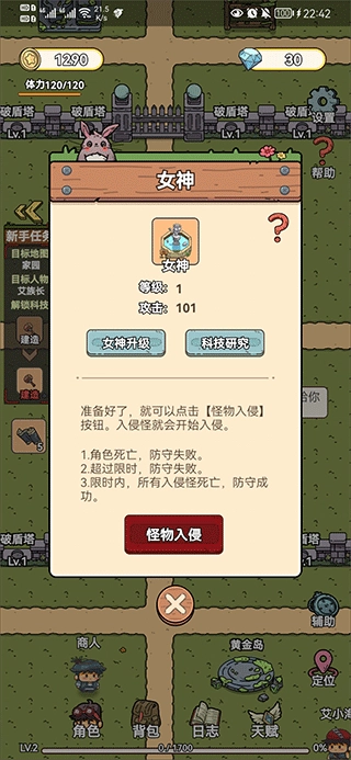 3、跟着任务十几分钟把新手任务走完,防守功能解锁。剩下的就靠自己随意发挥了。