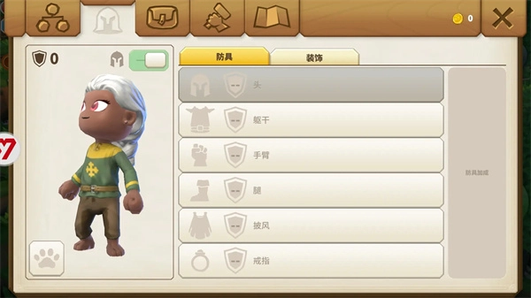 装备页(用来装备衣服和宠物,有些护甲会有特殊效果,会在右侧显示。当然还有装饰,则可以点击装饰和防具按钮进行装备页和装饰页的切换)