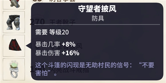 选择游侠20级披风,属性: ?暴击几率+8%, 暴击伤害+16%。