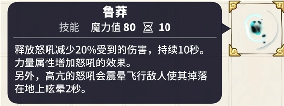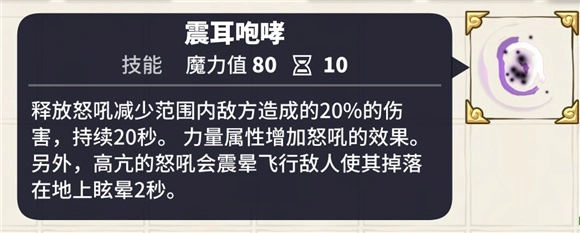 技能效果:战士群体减伤目标20%伤害,冷却10秒,力量属性增加怒吼效果,持续20秒。