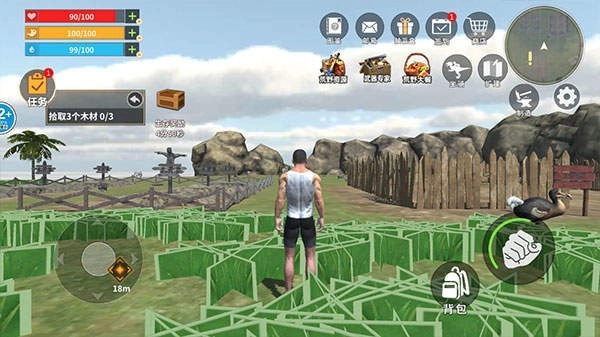 3、左上角的三个颜色条分别是生命值、饥饿值、水分,保持足够的数值才可以正常生存。