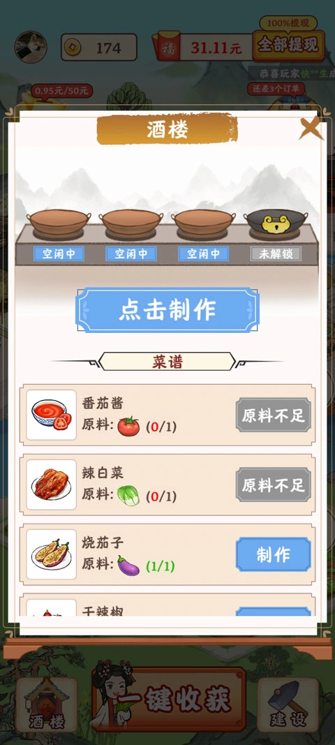 5、利用收集到的不同材料制作美味佳肴,售卖给顾客从而获取可观利润。