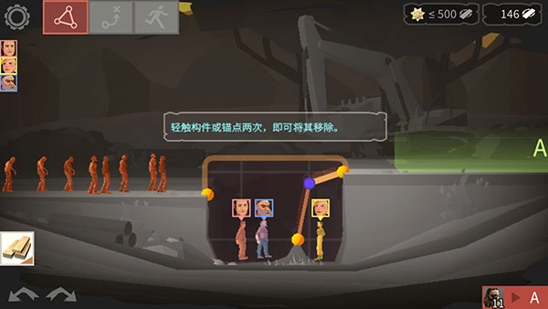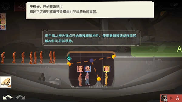 4、接下来请依照下方的说明,搭建出与橙色引导线相契合的桥梁支架,操作时用手指从橙色锚点处开始拖拽建筑构件即可。