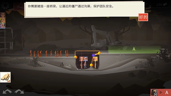 2、你的目标就是需要建造一座桥梁,让逼近的僵尸通过沟渠,以保护团队安全。