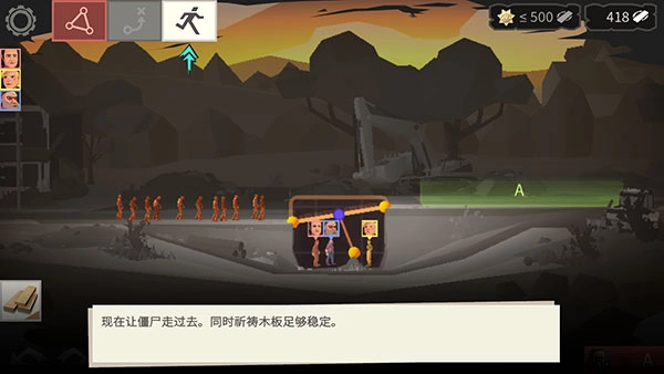 6、完成后,点击最上方的行走图标,让僵尸走过去,同时祈祷木板足够稳定。