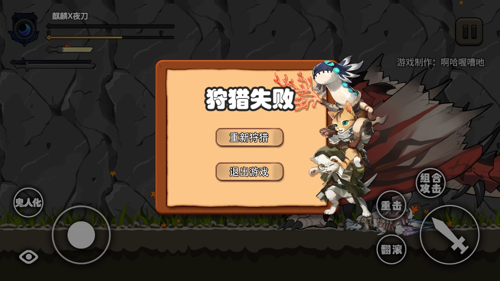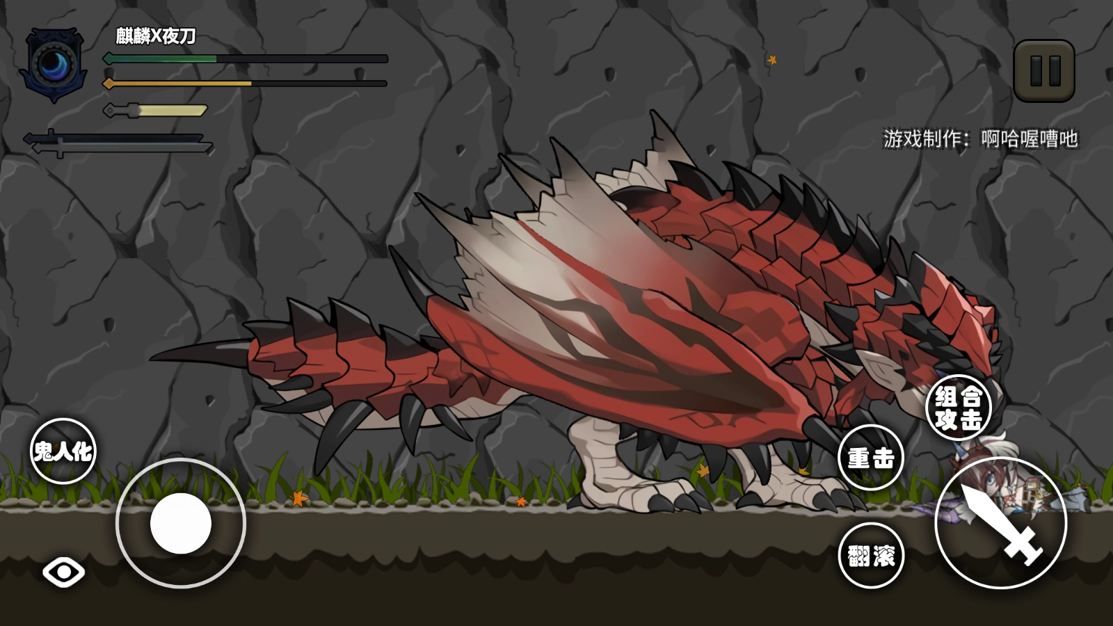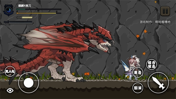 《怪物猎人》与《明日方舟》的同人闯关小游戏,由B站UP主“啊哈喔嘈吔”自制。主角是夜刀麒麟,目标是讨伐关卡中的巨龙,可运用重击、组合攻击等招式,每次攻击都能对怪物造成可观伤害;此外还能通过翻滚动作躲避怪物的攻击。