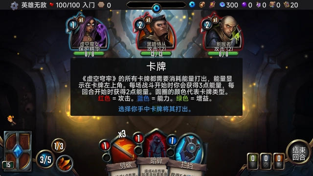 3、所有卡牌的打出都需要消耗能量,能量值会显示在卡牌的左上角位置。每场战斗刚开始时,你能获得3点能量,之后每回合开始时会再获得2点能量。卡牌上圆圈的颜色对应着不同的卡牌类型:红色代表攻击类卡牌,蓝色代表能力类卡牌,绿色则代表增益类卡牌。