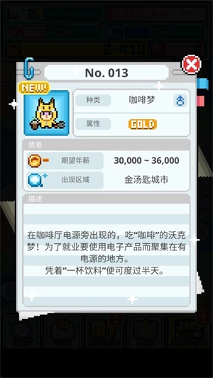 沃克梦,最初名为WorkeMon,是一款像素风格的模拟经营游戏。在游戏里,玩家需要招募各式各样的沃克梦,以此来经营属于自己的公司。游戏中提供了多种类型的沃克梦供玩家招募,趣味十足的经营玩法能为你带来别具一格的体验,而形形色色的随机事件则会让你感受到不一样的乐趣。此外,还有更多的设施物品等待你去解锁选择,你可以不断培养更多沃克梦,从而打造出最出色的公司。