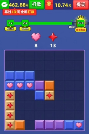这是一款超休闲又烧脑的拼方块游戏,每一关都藏着超有趣的挑战等你来解锁!是时候秀出你的空间想象力啦——把方块精准拼到对应位置,尽可能让它们大面积消除,这样就能快速完成关卡目标,赢取系统准备的丰厚奖励哦!