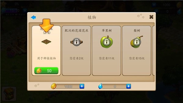 1、进入农场后,点击左下角的背包,选择【植物】分类栏,然后购买花床(例如50金币的种植地)。