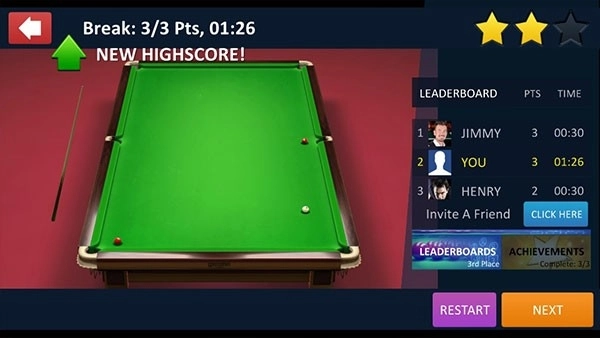 1、玩家能够借助观察球的位置与台球的运行轨迹,来挑选最合适的击球方向和力度,从而获取最高的分数以及星级评定。 2、游戏结束之后,玩家可以查看自身的排名状况,并且选择重新开启当前关卡或者进入下一个挑战关卡。