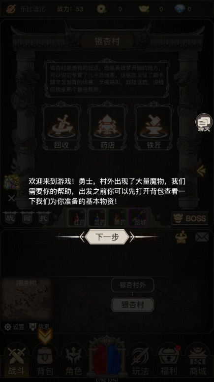 1、欢迎来到游戏!勇士,村外出现了大量魔物,我们需要你的帮助,出发之前你可以先打开背包查看一下我们为你准备的基本物资!