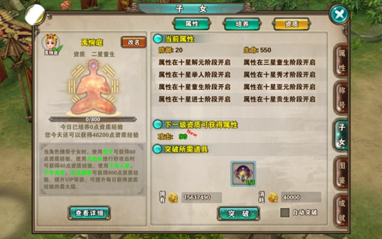 当子女等级达到20级时,可开启资质界面,此后可使用天仙水、包子、千年人参、千年灵芝、冬虫夏草提升子女资质经验,获得基础属性加成,提升战力
