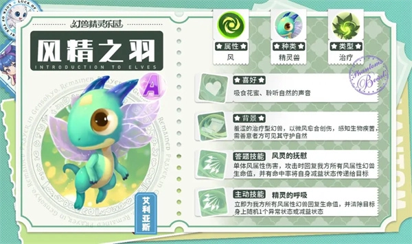 主动技能效果:能即刻为我方全体风属性幻兽恢复生命值,同时移除目标身上随机一种负面状态。