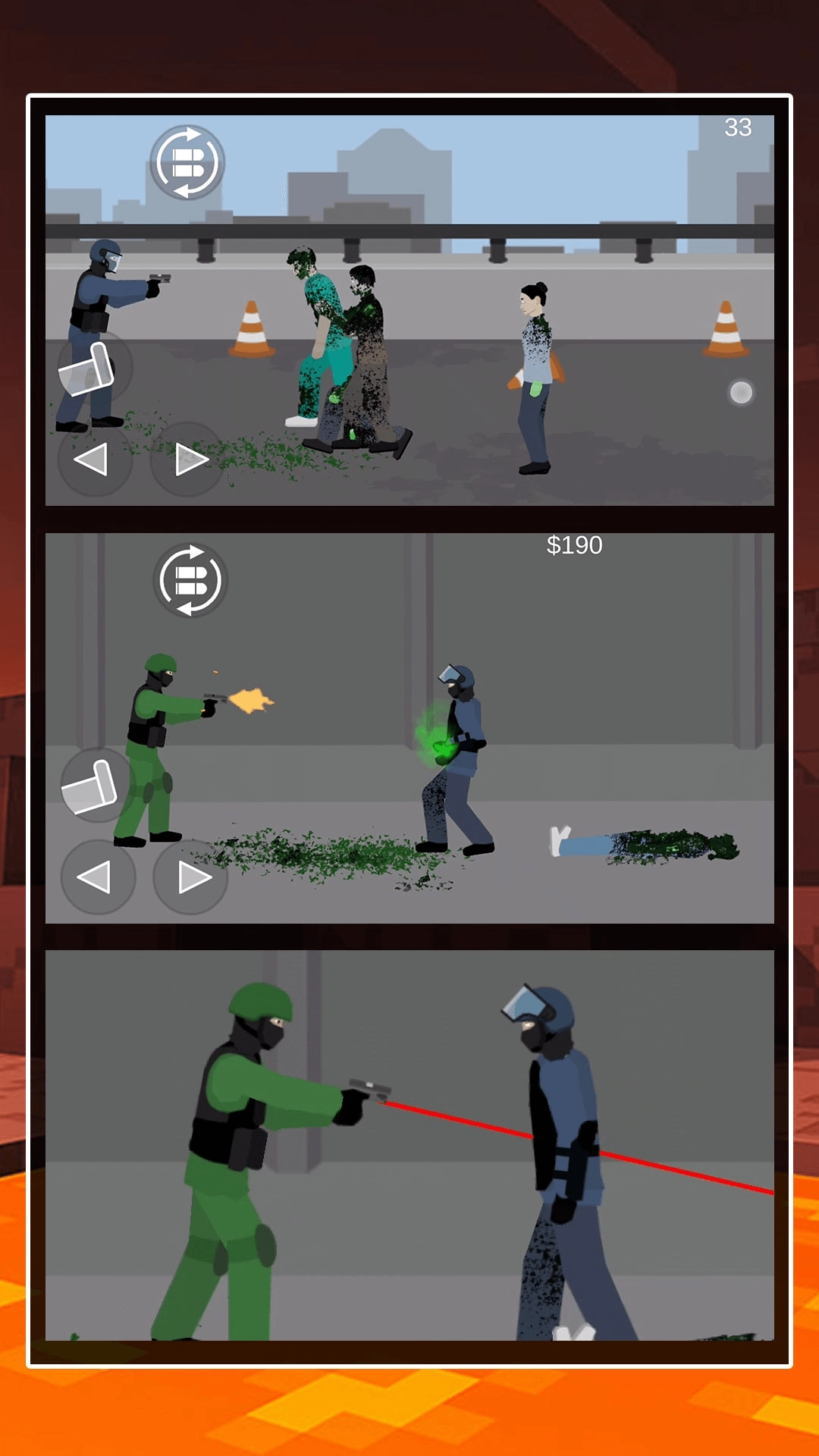 1、游戏通过触摸屏幕进行瞄准射击,并点击虚拟按键便可以移动。