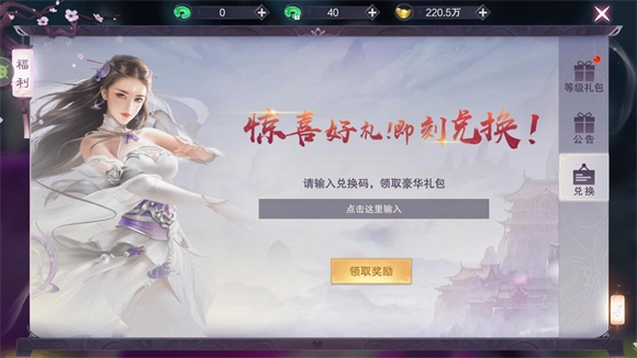 兑换方法:在界面中点击右上角的福利大厅,接着点击兑换按钮,把礼包码输入到兑换框内,再点击领取,这样就能完成兑换了。