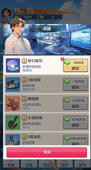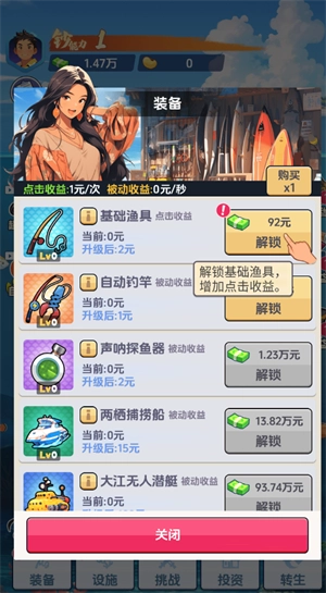 2、通过解锁、升级装备,来提升自己的钓鱼能力