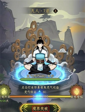 6、要记住提升角色修为是非常重要的,所以得去收集更多灵气,等灵气攒满了就能突破境界了。