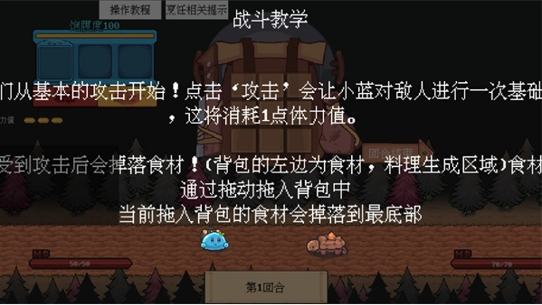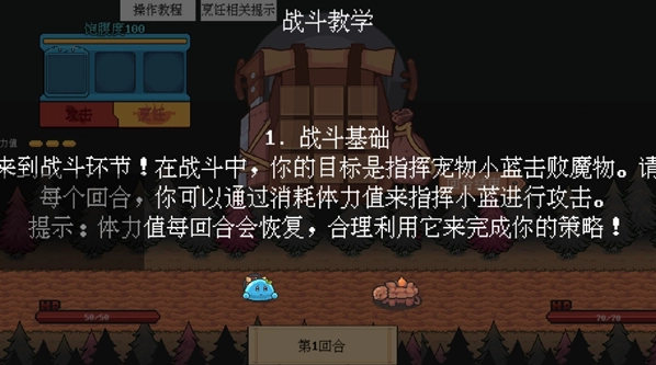 3、闯关过程中,玩家还需依据系统提供的“战斗基础”教学进入战斗环节!战斗时,你的任务是指挥宠物小蓝战胜魔物。