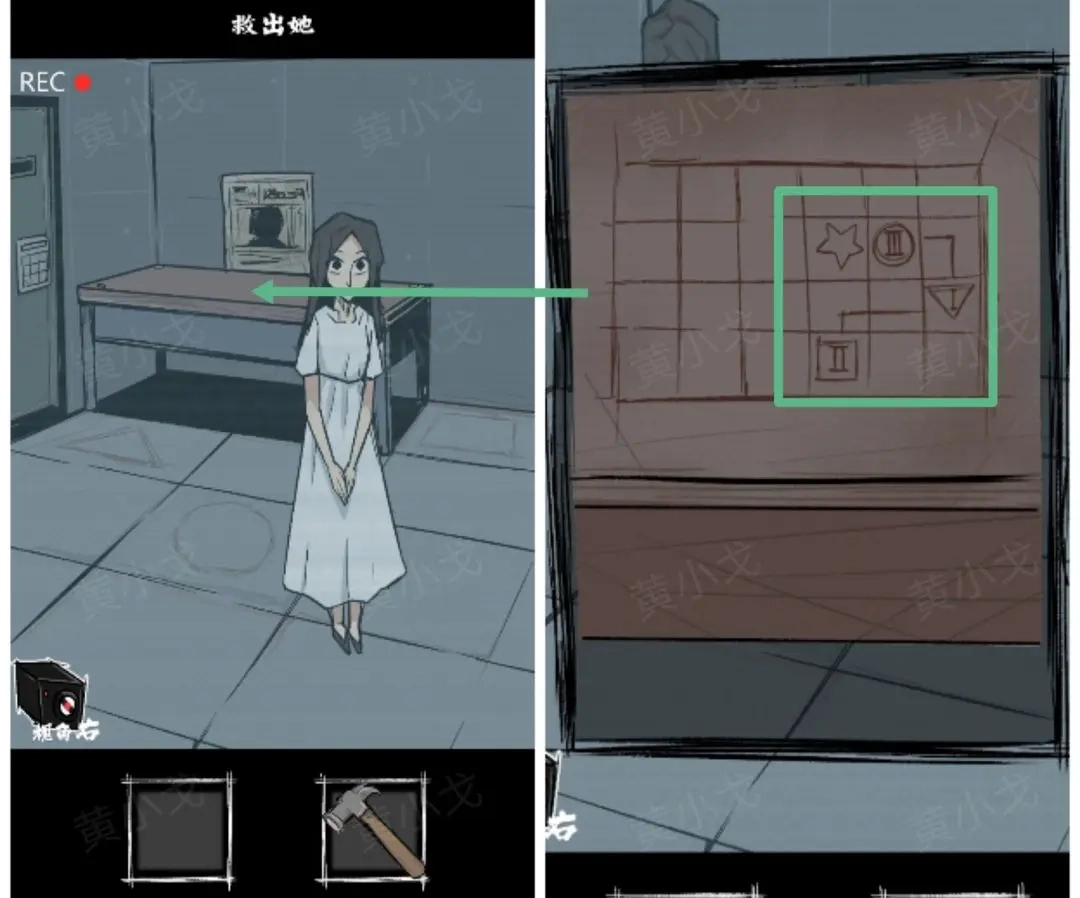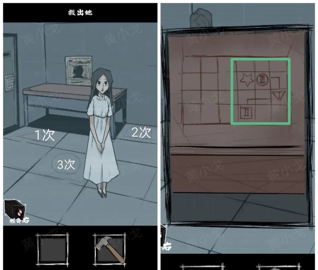 6.依据桌上的涂鸦,按照指定顺序与点击次数,依次点击带有相同图案的地砖——圆形点击三次、三角形点击一次、正方形点击两次。