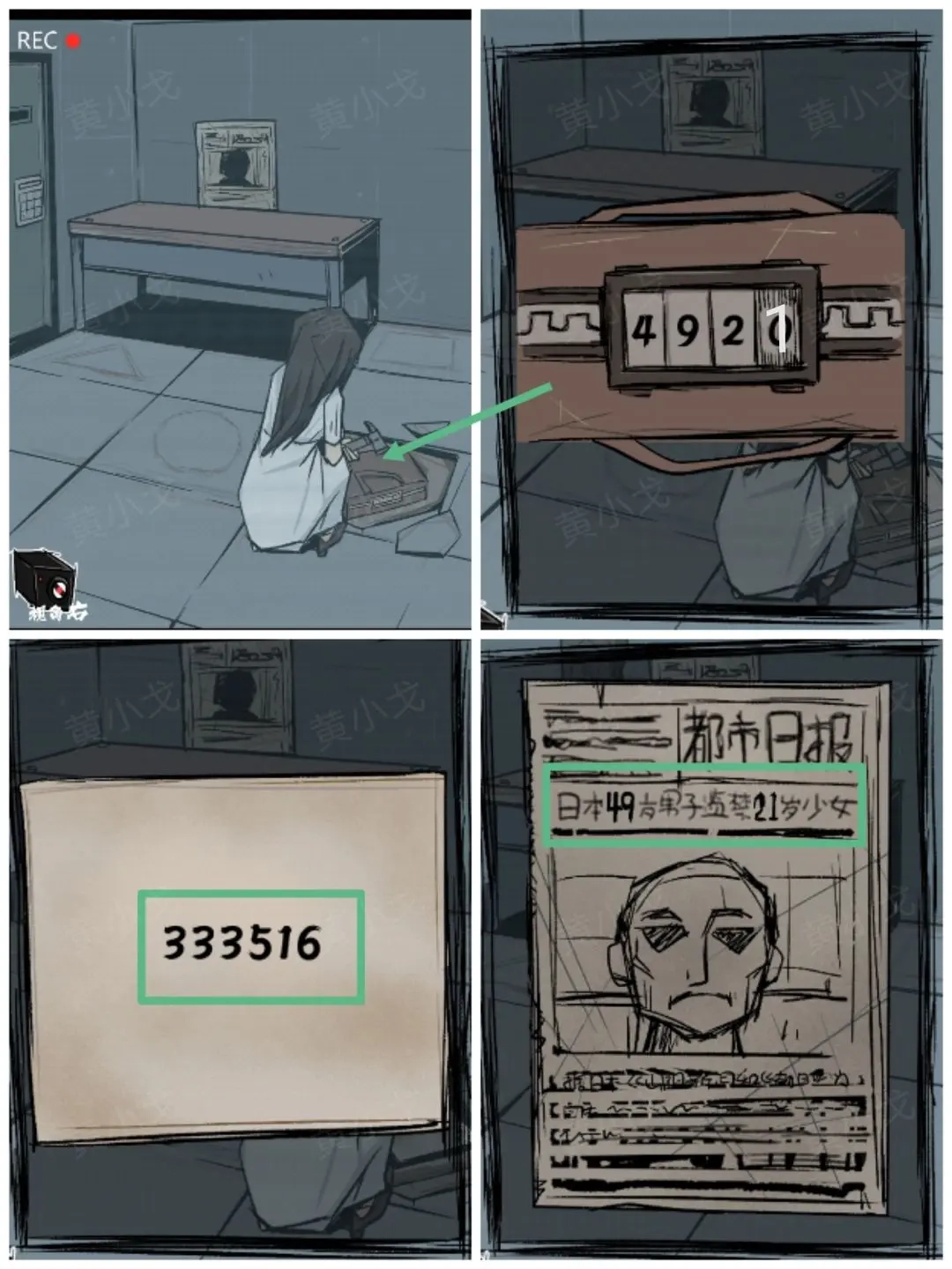 8. 点击行李箱,按照报纸上的提示输入密码4921以打开它,从中获取线索(333516,该密码为随机生成)