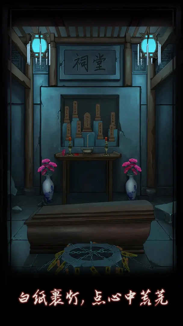 8.纸花相关线索:先从祭桌上拿起纸花,接着把它插到花瓶里,然后认真观察这个花瓶,就能得到关键线索了。