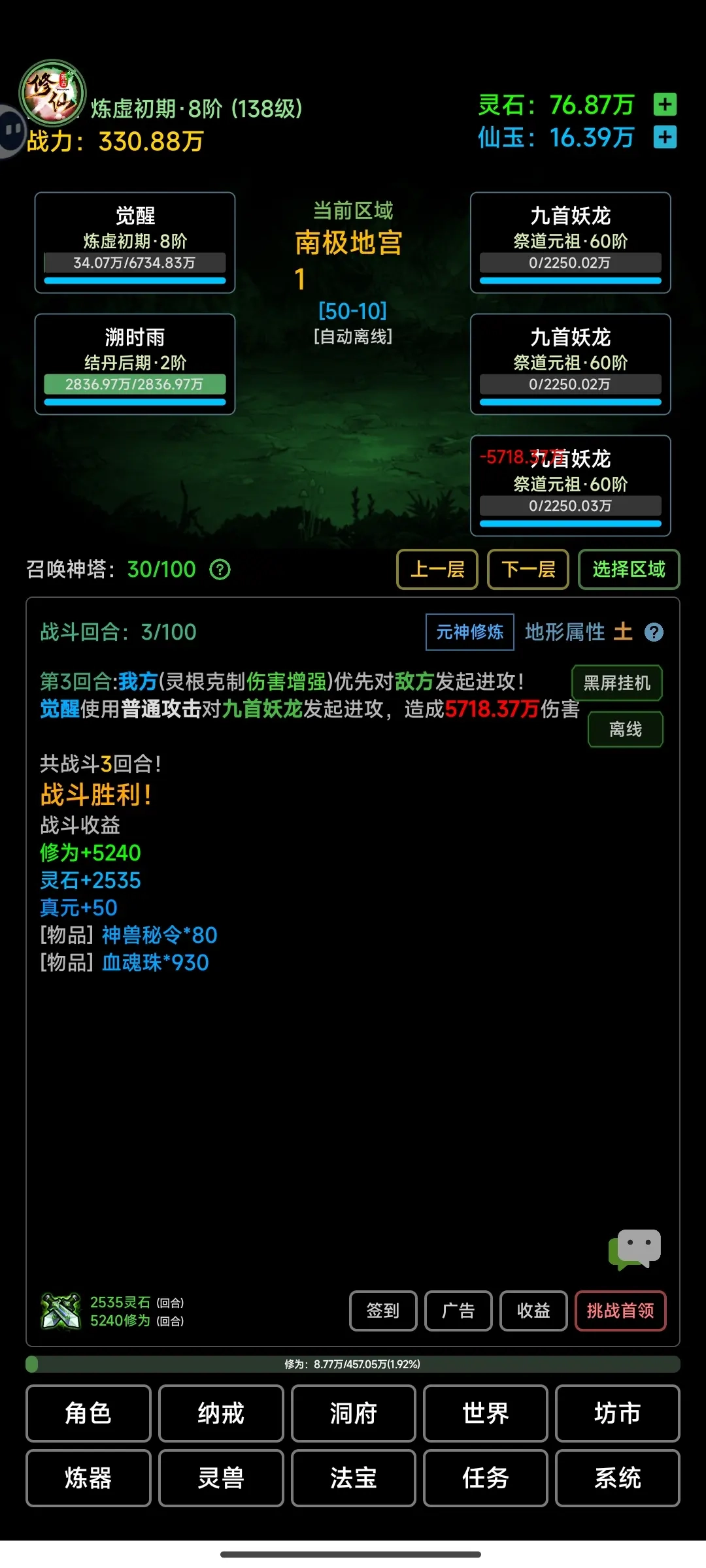 4、等修为提升到筑基中期后开启自动升级功能,持续在1图9挂机修炼,这里每轮能获取330点修为,大概每分钟能刷23轮怪物。期间可以偶尔去2图2试试能不能做到秒杀,如果能的话,就可以在那里挂一会儿,收集一套套装——这套装备能带来40%的气血加成,之后再回到1图9继续挂机。(要是能秒杀2图9的怪物,每轮就能拿到430点修为,每分钟差不多16轮)