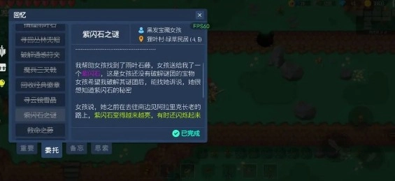 4. 先与工会里的这个小女孩对话,接着前往工会旁边的房子,把雨叶石藤交给她,就能获得紫闪石。紫闪石所指引的位置如图所示,在这个地方,我们会找到繁花秘闻。