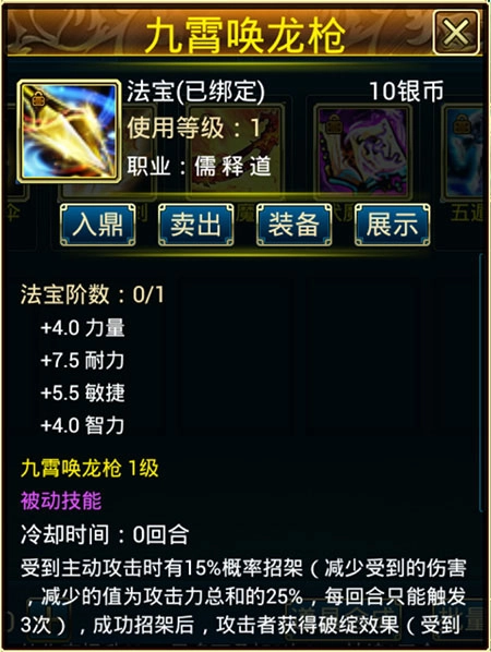 蜀山传奇的顶级法宝,具有强大的法力,能够大大增加散仙的战斗力,可以在大闹龙宫之神器现世,仙草还魂等限时活动中获得,具体展示如下: