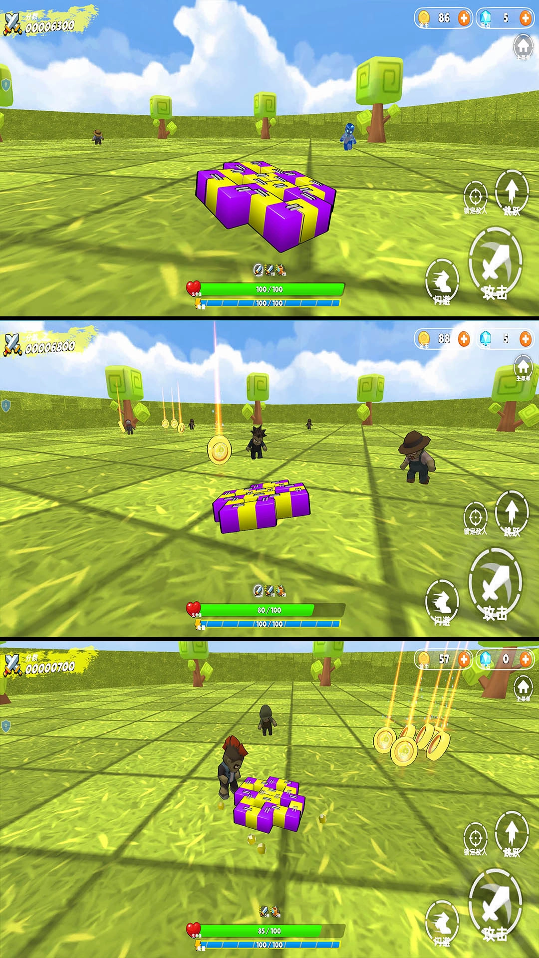 进入战斗地图后,玩家需要操控陀螺的移动,并巧妙运用右侧的跳跃、攻击和闪避按键来展开战斗,力求消灭更多敌人以赚取更多金币!
