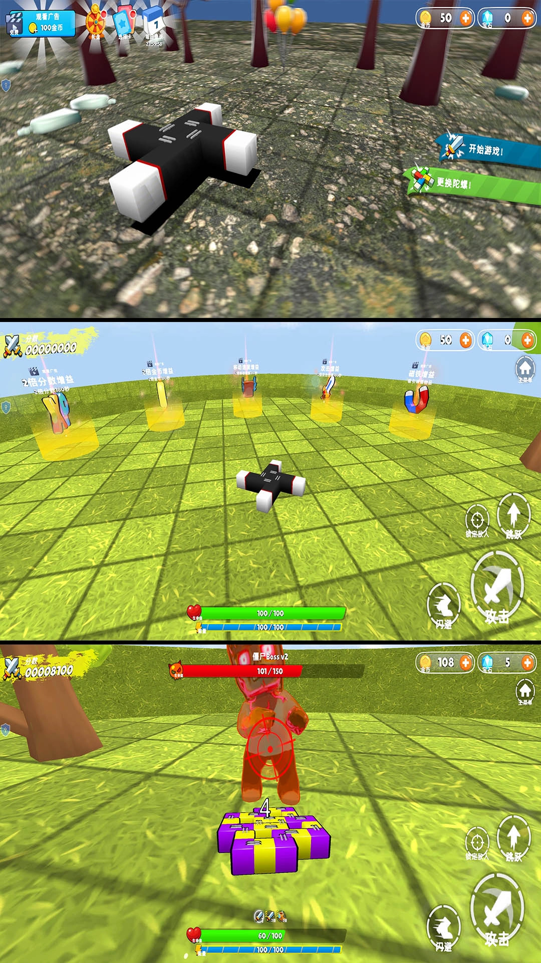 1.实时控制陀螺进行移动与旋转,借助惯性来调整攻击的角度和轨迹,从而精准打击地图里随机出现的僵尸、怪物之类的敌人。