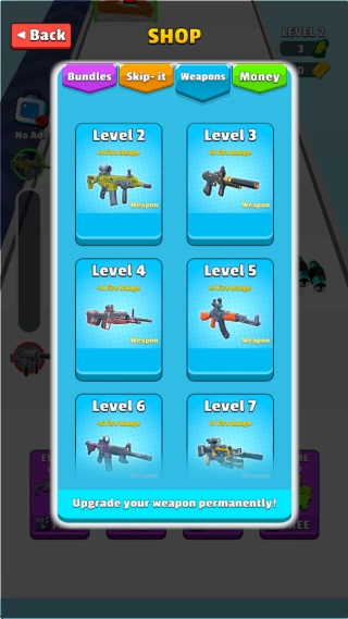 1.进入关卡后,玩家可消耗金币提升枪械的初始性能,以此在闯关过程中获得更多奖励。