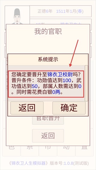 4、晋升为【锦衣卫校尉】,需满足功勋达到100、武功达到50等条件。请先通过完成任务积累相应属性,待各项条件达标后,点击确定即可完成官职晋升。