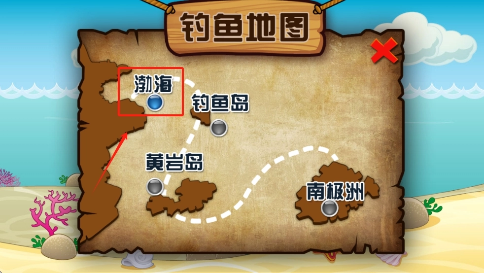 2、在“钓鱼地图”上选择“渤海”,点击确认开始钓鱼。