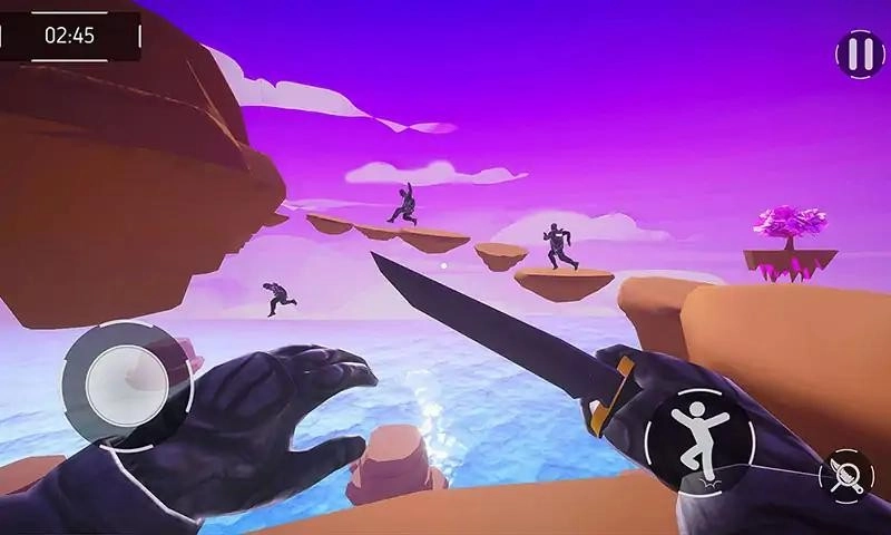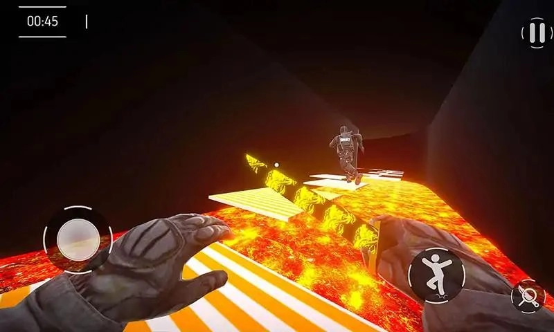 3、左下角的摇杆用于控制角色的移动方向,右下角的按钮可触发跳跃或攻击动作,玩家需瞄准敌人展开对决,同时注意规避赛道上的障碍。