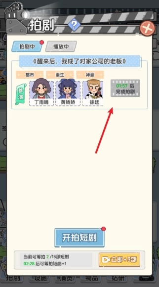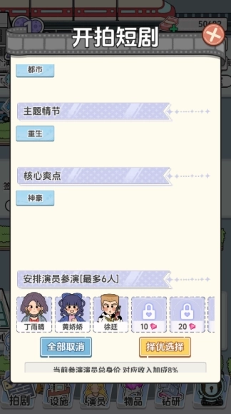 2、接着就可以着手拍摄短剧了,选择好题材、演员后,设置好投入资金和剧名后即可开始。